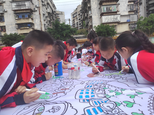 三明市三元区东安小学学生在画卷上勾勒地球母亲: