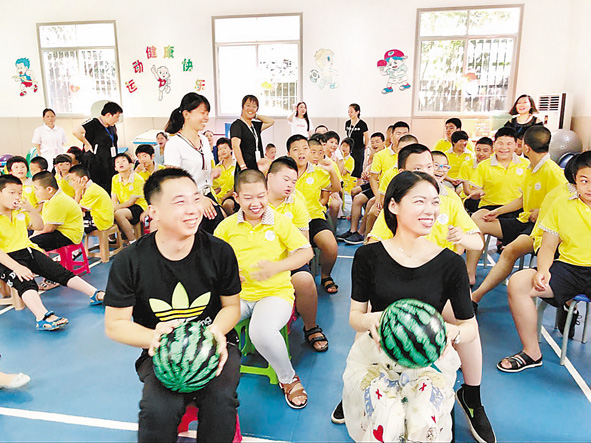 5月30日,在“六一”儿童节来临之际,省东辰建设工程集团有限公司青年团员来到福州市晋安区特殊教育学校,送去空调被、学习用品、运动器材以及节日的问候。大家观赏了孩子们创作的艺术作品,并观看了孩子们热情洋溢的舞蹈。图为该集团公司青年团员与孩子们玩起了“开心传西瓜”游戏。 ■ 刘晓茹