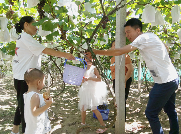 图为7月22日,游客在莲峰镇姚坊村土地整理项目区葡萄园体验采摘消费的情景。 ■ 周宗胜