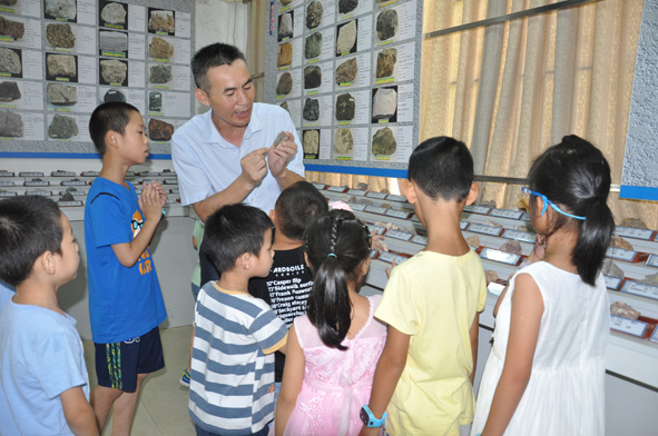 7月26日,省第八地质大队(核工业二九五大队)关工委组织22名职工子女到该队科技科普中心参观学习。在活动中,小朋友们参观了地球奥秘展厅、地质勘探成果室、矿物标本室、钻探设备陈列室,还观看了地质科普电教片。图为小朋友们在了解地质科普知识,近距离观察矿物与岩石标本。■ 华珑玲