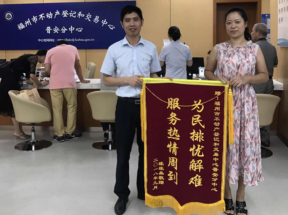 9月5日,福州的练女士来到福州市不动产登记和交易中心晋安分中心,送上一面写着“为民排忧解难,服务热情周到”的锦旗,表达她的感激之情。